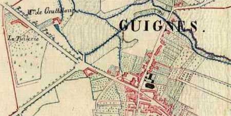 | Plan de Guignes au XIXe siècle. Monographie de Guignes, par Baudrier, instituteur (1er janvier 1889). Fichier libre de droits selon les termes de la licence Creative Commons. |