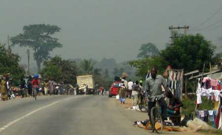 | En route vers Kumasi. On remarque une formidable activité humaine le long des chaussées, et pas uniquement dans les villages (photo: Marc Verney, février 2008). |