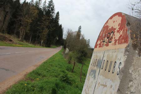 | Sur la R.N.492 historique, à la frontière entre Doubs et Jura, après Nans-sous-Sainte-Anne (photo: Marc Verney, avril 2023). En cliquant sur l'image, vous entamez la promenade sur cette route. |