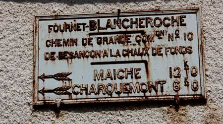 On prend la direction de Charquemont par la rue des Combes. Si la carte d’état-major du XIXe siècle (1820-1866) publiée sur internet par l’IGN ne montre que des chemins de terre dans la région, on apprend, en lisant le Bulletin officiel des délibérations du Grand conseil de la République et canton de Neuchâtel de 1877 que la route de Maîche à la Suisse «vient d'être déclarée d'utilité publique par le Conseil général du Doubs». Elle se dirigera «de Biaufond par la Cendrée à Charquemont et Maîche», «C'est de 1339 que date la plus ancienne mention connue de Charquemont, à l'occasion d'un traité de partage territorial», écrit le site racinescomtoises.net. On entre aujourd’hui dans ce village par les rues des Quatre-Vents et de Besançon. «Au XIVe siècle, lit-on sur le site charquemont.fr, le territoire où va se développer Charquemont est en cours de défrichement, particulièrement "les côtes" du Doubs au dessus du lieu-dit "la Mort". En face, sur la rive droite, les colons du prince-évêque de Bâle défrichaient également en aval de Biaufond, ce qui allait devenir le territoire des Franches-Montagnes». Au fil du temps, l'industrie horlogère prend une grande place, à côté de la production de fromage et des exploitations forestières: en 1869, «il y avait déjà à Charquemont 138 ateliers produisant des pièces d’horlogerie et employant près de 500 ouvriers», signale le site municipal. A la sortie du bourg, la R.N.464 historique prend la direction de Biaufond et de la Suisse par la Combe-Saint-Pierre et la Cendrée. On notera, écrit Wikisara que le tracé terminal de la petite nationale Besançon-la Suisse fut «détourné avant son déclassement entre Charquemont et la frontière pour desservir Fournet-Blancheroche». De nos jours, «le tracé originel semble ne plus être carrossable au-delà de la Cendrée», signale encore ce site. En bas, sur le Doubs, et à cheval sur la frontière franco-suisse, le pont métallique de Biaufond (1881) est plus vieux que la tour Eiffel! Côté suisse, lit-on dans le dossier Les chemins historiques du canton de Neuchâtel, «la route des Côtes du Doubs est la version la plus moderne d'un très ancien cheminement entre Neuchâtel et la rive française du Doubs, à Maîche. La "via de Maches", connue plus tard sous le nom de "chemin de Blancheroche" est citée en 1401. Malgré sa forte déclivité, le chemin est considéré comme carrossable au XVIIIe siècle». Mais cela n'est pas suffisant pour le trafic moderne... «Dès 1870, voit-on encore dans ce dossier de l'Inventaire des voies de communication historiques de la Suisse (IVS), on étudie un ambitieux projet pour une route internationale, avec une largeur de 5 mètres, une pente maximum de 9% et un pont sur le Doubs. Construite entre 1873 et 1893, cette route est, avec ces courbes audacieuses, ses tunnels et ses murs de soutènement, un exemple achevé de route d'ingénieur du XIXe siècle»... De Besançon à la Chaux-de-Fonds, nous aurons parcouru 105 kilomètres environ.