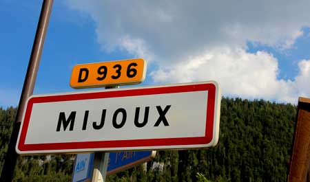 | Au col de la Faucille, on trouvait cette ancienne indication touristique évoquant Mijoux... tout en bas dans la vallée (photo: