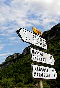 | Panneaux indicateurs à Thoirette. Jusqu'à Dortan, la route n°436 historique n'est qu'une chaussée de promenade le long de la vallée de l'Ain (photo: MV, juillet 2017). |