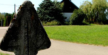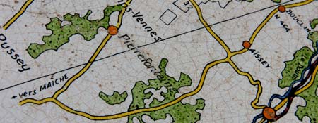 | Non loin du tracé de la R.N.464 historique, ce vieux Michelin des années trente indique Droitfontaine (photo: MV, août 2025). |