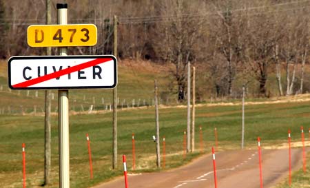On arrive dans le Jura. La carte Michelin Beaune-Evian de 1955 montre ici une curiosité de cette petite route nationale. Entre la borne de limites départementales et le hameau de la Gaudine, la chaussée –très étroite- est décrite comme simplement «empierrée» alors que, de part et d’autre, on a affaire à une route «revêtue» et plutôt large. A la Gaudine, on laisse, sur notre gauche, la petite halte de l’ancien tram pour filer en ligne droite vers Cuvier. «Ce village fait partie du val de Mièges, il est situé dans un bas-fond», dit A. Rousset dans le Dictionnaire géographique, historique et statistique des communes de la Franche-Comté en 1854. A l'époque, on parle ici du chemin de grande communication n°20, de Nozeroy à Levier pour évoquer notre R.N.473 historique. Le village est traversé de part en part par la Grande-Rue, qui aboutit, quelques centaines de mètres après Cuvier, au carrefour avec la route n°471, terme de notre promenade entre Beure et le val de Mièges. En direction de Champagnole, on trouve le Magasin de Censeau. C’était l’un des lieux importants du commerce du sel dans la région: «Venant de Montmorot, les bosses de sel (très prisées en Suisse pour la fabrication du gruyère) transportées par les bœufs, étaient déchargées aux entrepôts réservés à cet effet», écrit le site routedescommunes.com. «D’autre part, dit encore ce site, Censeau, traversé par deux axes importants de communication a toujours vu passer la cohorte de ceux qui empruntaient ces routes. Pendant des générations, c’est au "Magasin" que l’on changea les chevaux qui tiraient les lourdes diligences assurant le trafic entre Champagnole et Pontarlier, et entre Salins-les-Bains et la Suisse».