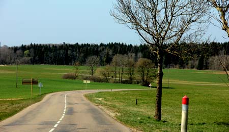| Après Pugey, notre voie met le cap sur le Bonnet-Rond. Ici, l'actuelle D141 laisse partir sur la gauche, le «chemin des Prés-Bassand» qui fut, au début du XIXe siècle, la route n°67 (photo: MV, mars 2022). |