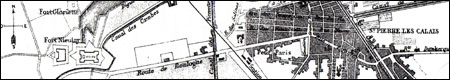 | Arrivée de la route de Boulogne sur Calais au XIXe siècle. On voit, à gauche, le fort Nieulay, qui commandait les approches de la ville (Source: Calais, son histoire et son port). |